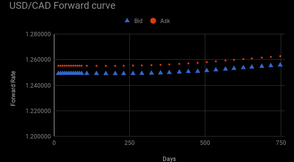 As can be seen, the forward curve is relatively flat. This is due to a small gap between the interest rates of the two currencies.